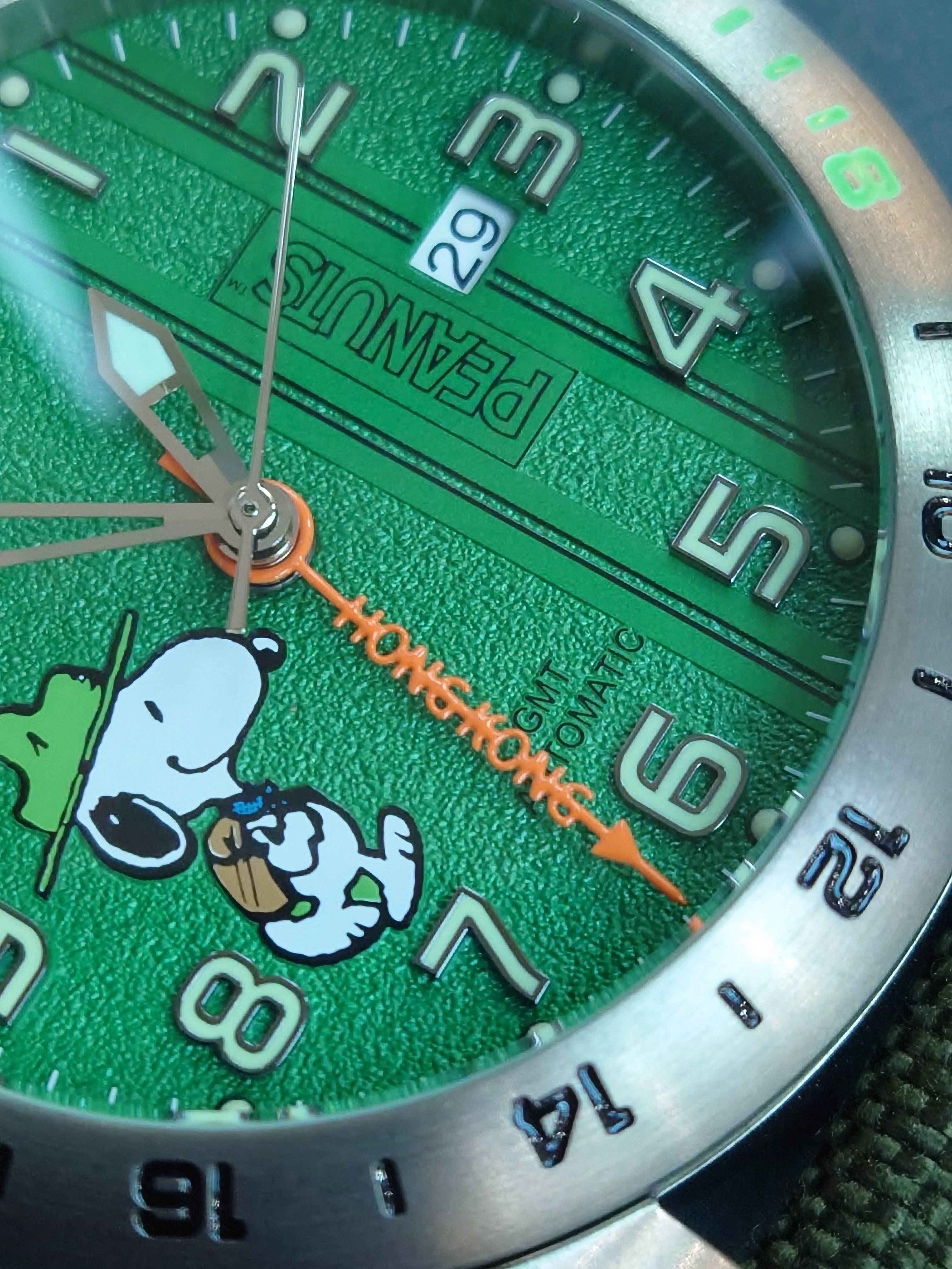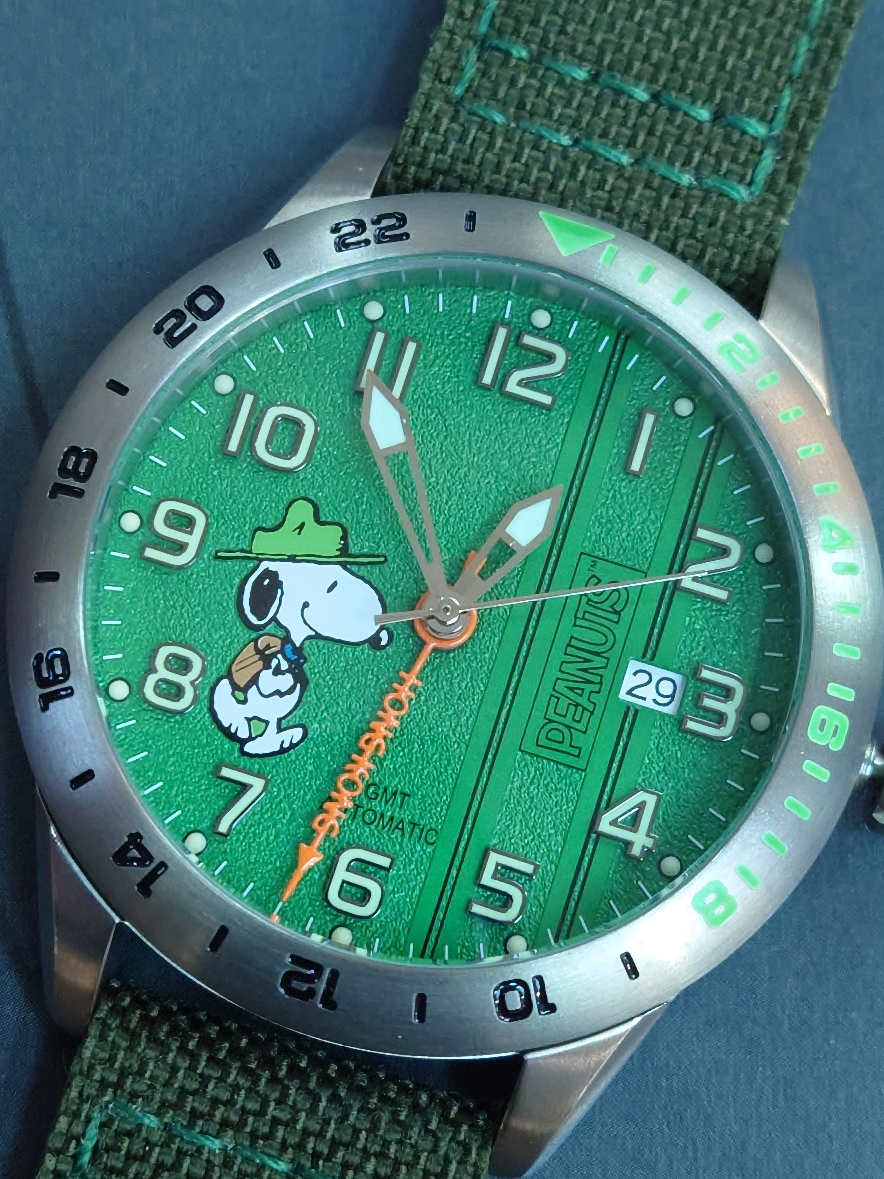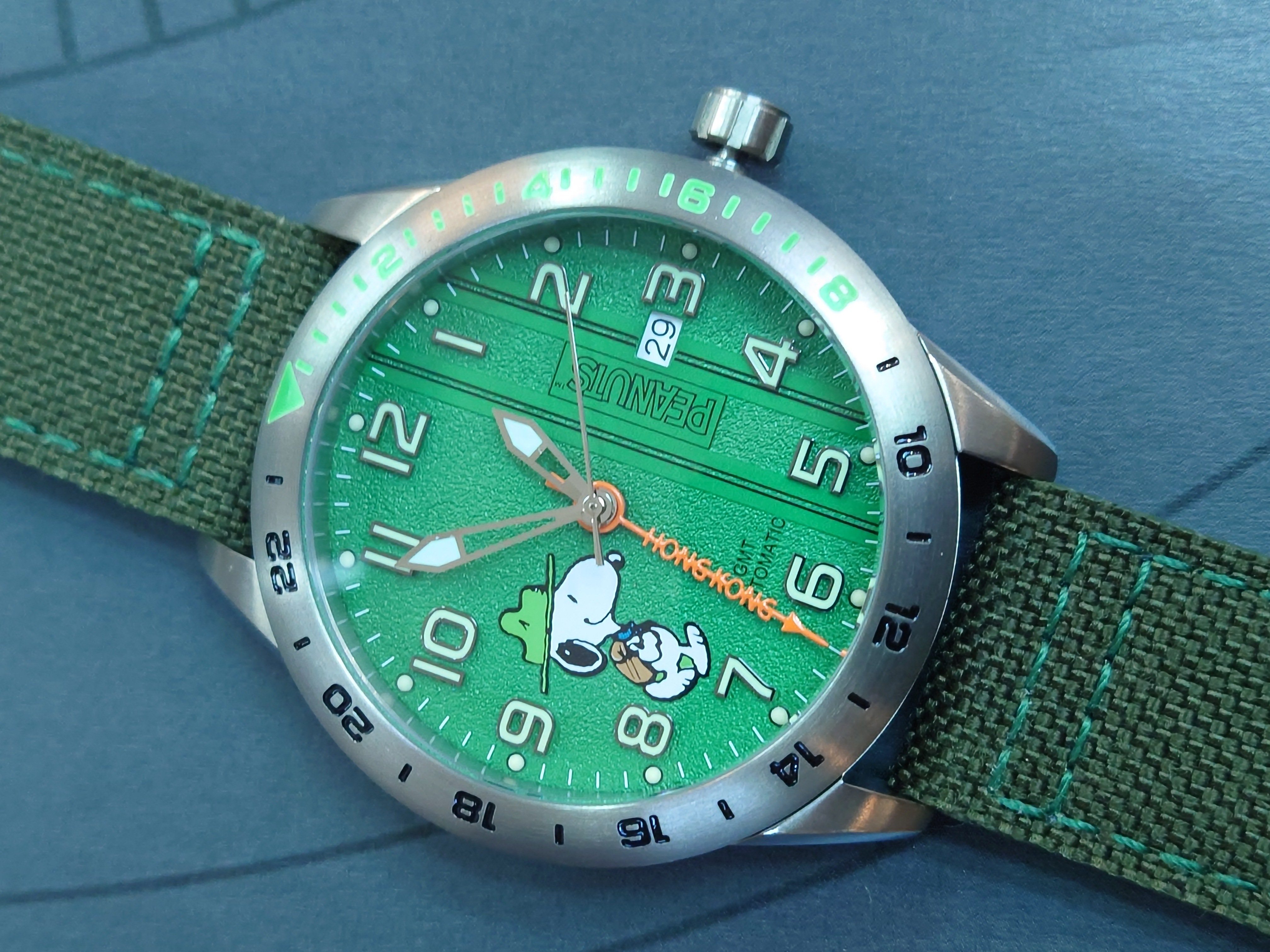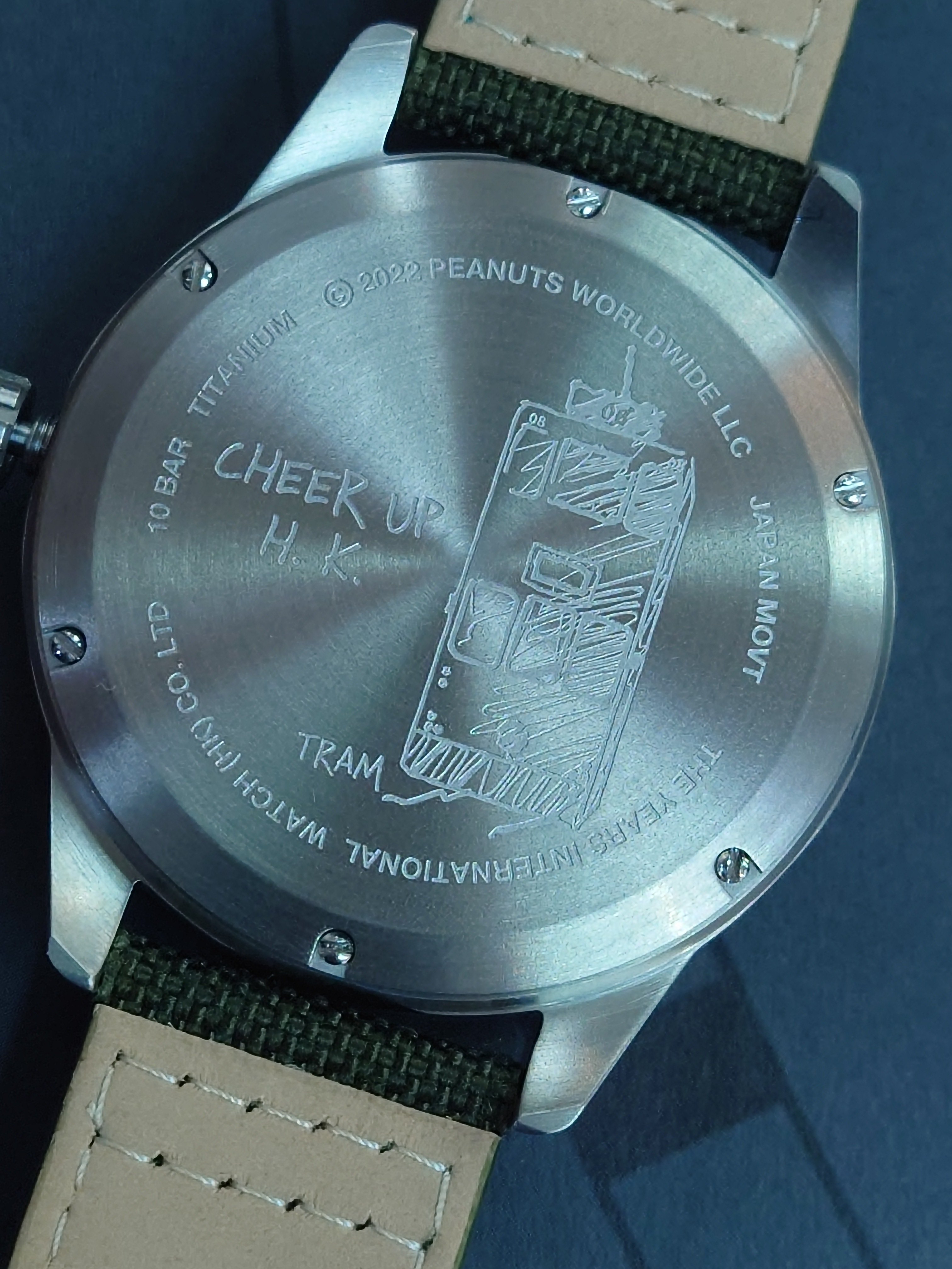 Snoopy 香港情懷系列 - "Cheer UP H.K." 自動機械錶,包括有香港的百年電車、大坑舞火龍、尖沙咀鐘樓及奶茶與蛋撻,採用NH34 GMT 機芯, 特別將GMT針設計成HONG KONG字樣. 香港製造. 2年官方保養 錶徑:42mm 機芯:NH34 GMT 錶殼:鈦金屬 錶鏡:礦物水晶 防水:100米防水