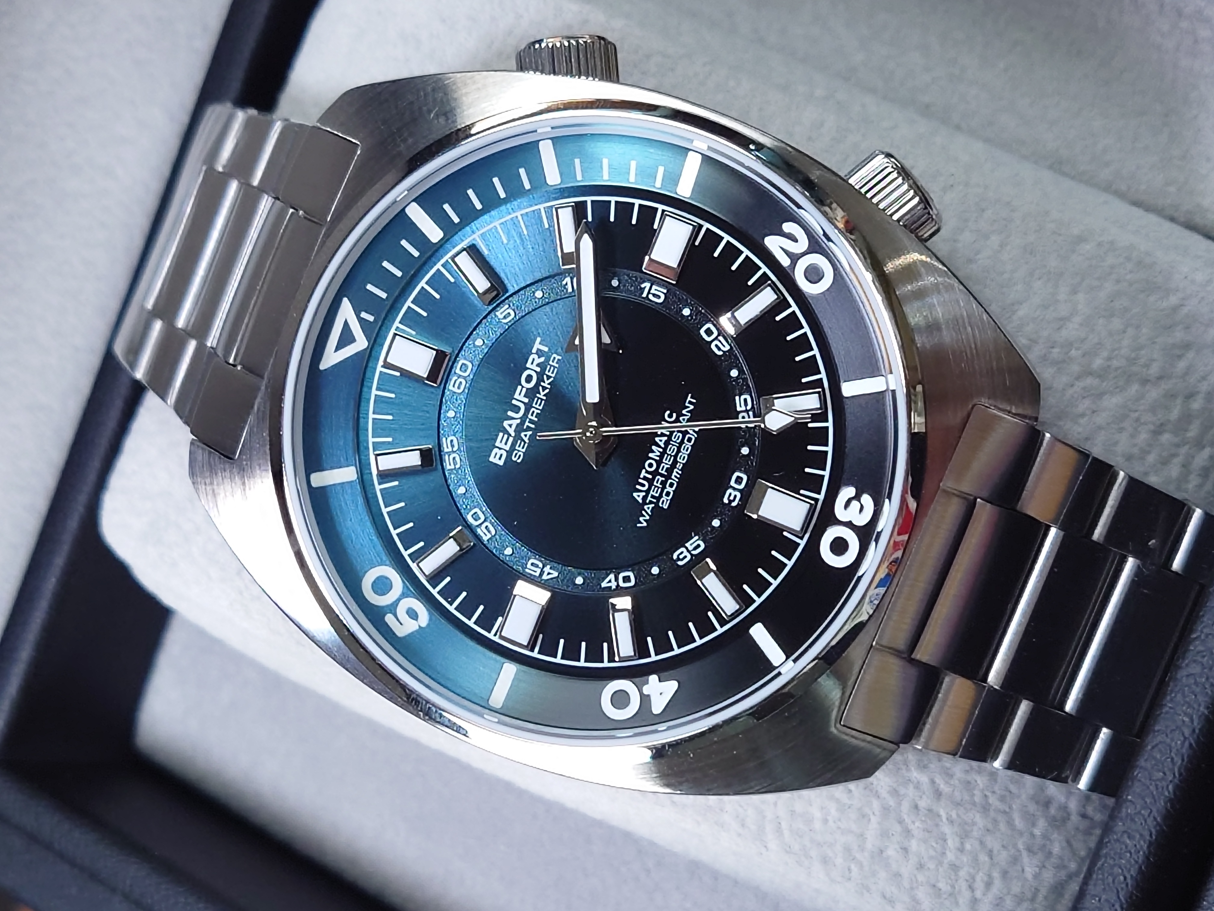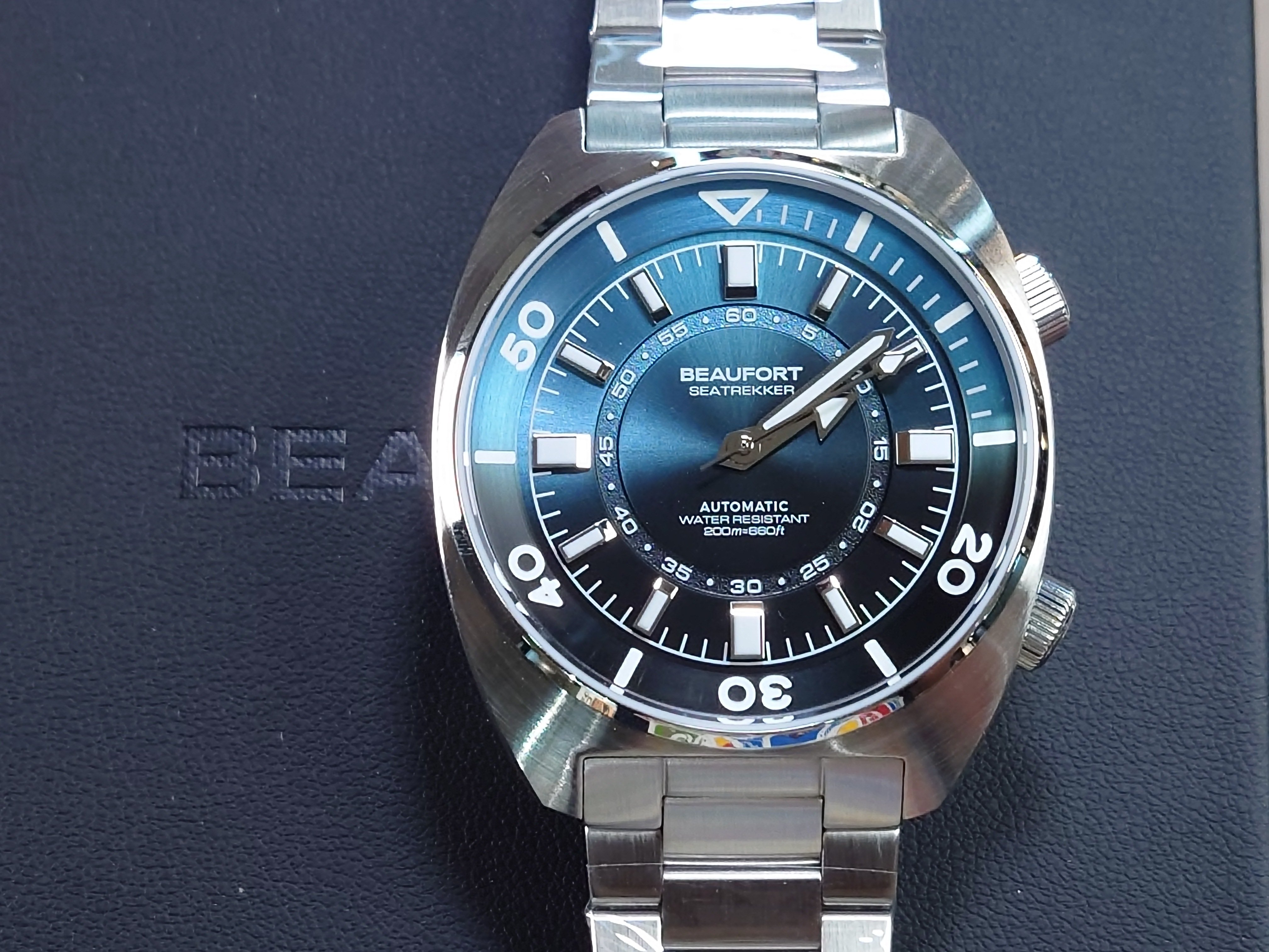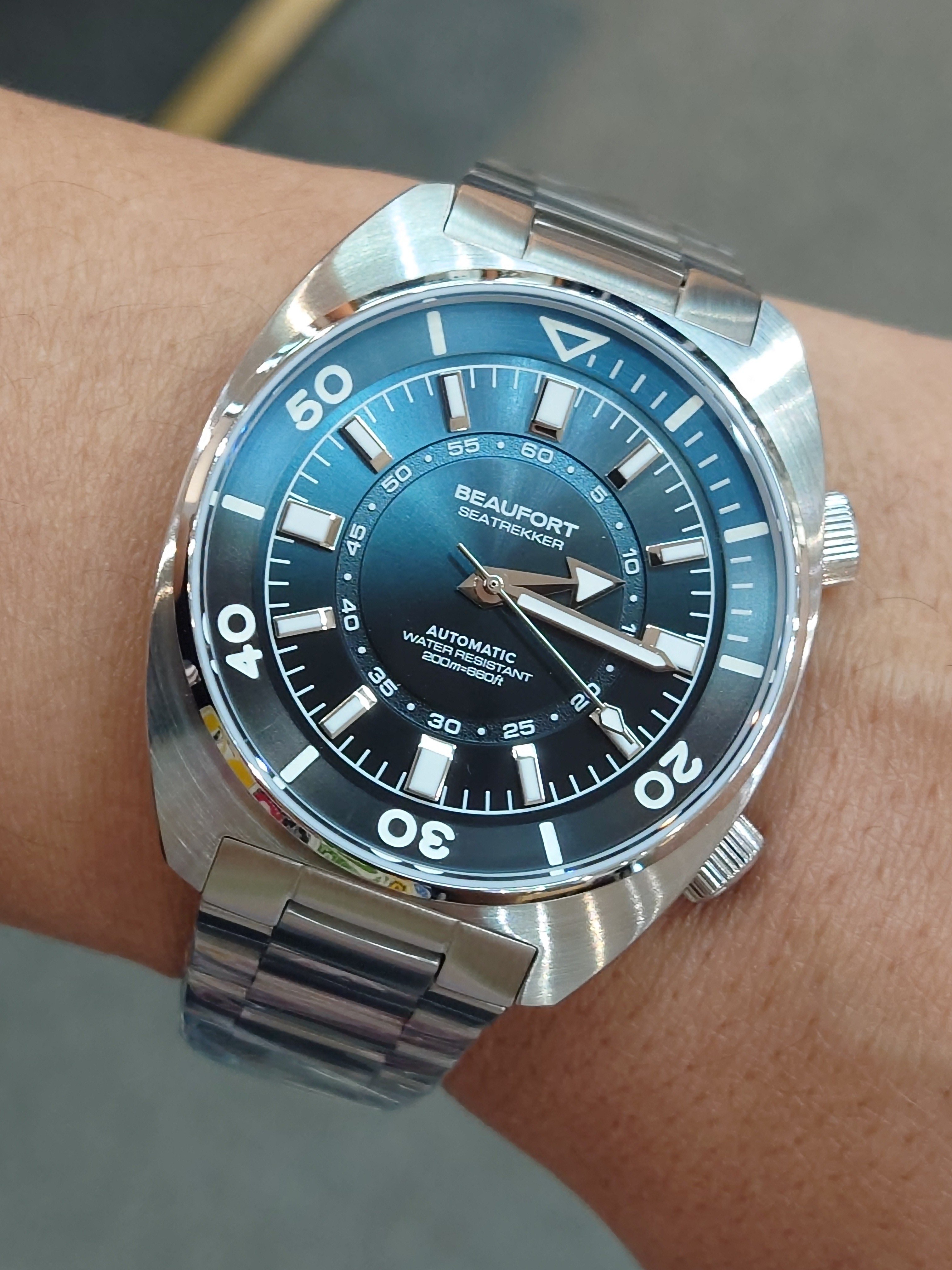 Seatrekker腕錶的設計靈感源自於20世紀70年代的超級壓縮腕錶,採用雙錶冠錶殼和內部錶圈,以此向那個時代致敬。 Seatrekker 腕錶飾以高度拋光的刻度,並採用華麗的漸變飾面,展現出優雅而堅固的潛水錶形象。 附有不銹鋼扁平鏈節錶帶,可隨時微調。 錶殼尺寸:39mm 錶殼厚度:12.5mm 錶殼材質:316L鋼 錶帶材質:316L鋼 錶帶扣:蝴蝶扣 機芯:Miyota 9039 手錶鏡片:藍寶石水晶 防水級別:200米防水